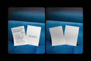 The elegant blue sofa adds a touch of sophistication, making this mockup ideal for promoting events, advertisements, or personal art pieces. Whether you’re designing for a gallery, a business, or your portfolio, this mockup ensures your work stands out.