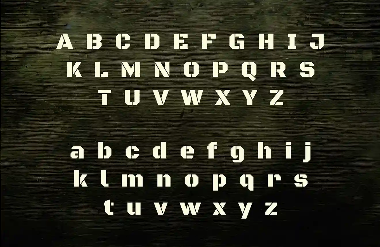 The font’s confident, stencil-like look delivers a sense of authority and action, making it the perfect choice for esports tournaments, FPS game menus, military-themed logos, or even rugged outdoor branding. Its semi-geometric construction brings a modern flavor to its traditional stencil roots, blending the old-school military style with a fresh, powerful aesthetic ready for the future.