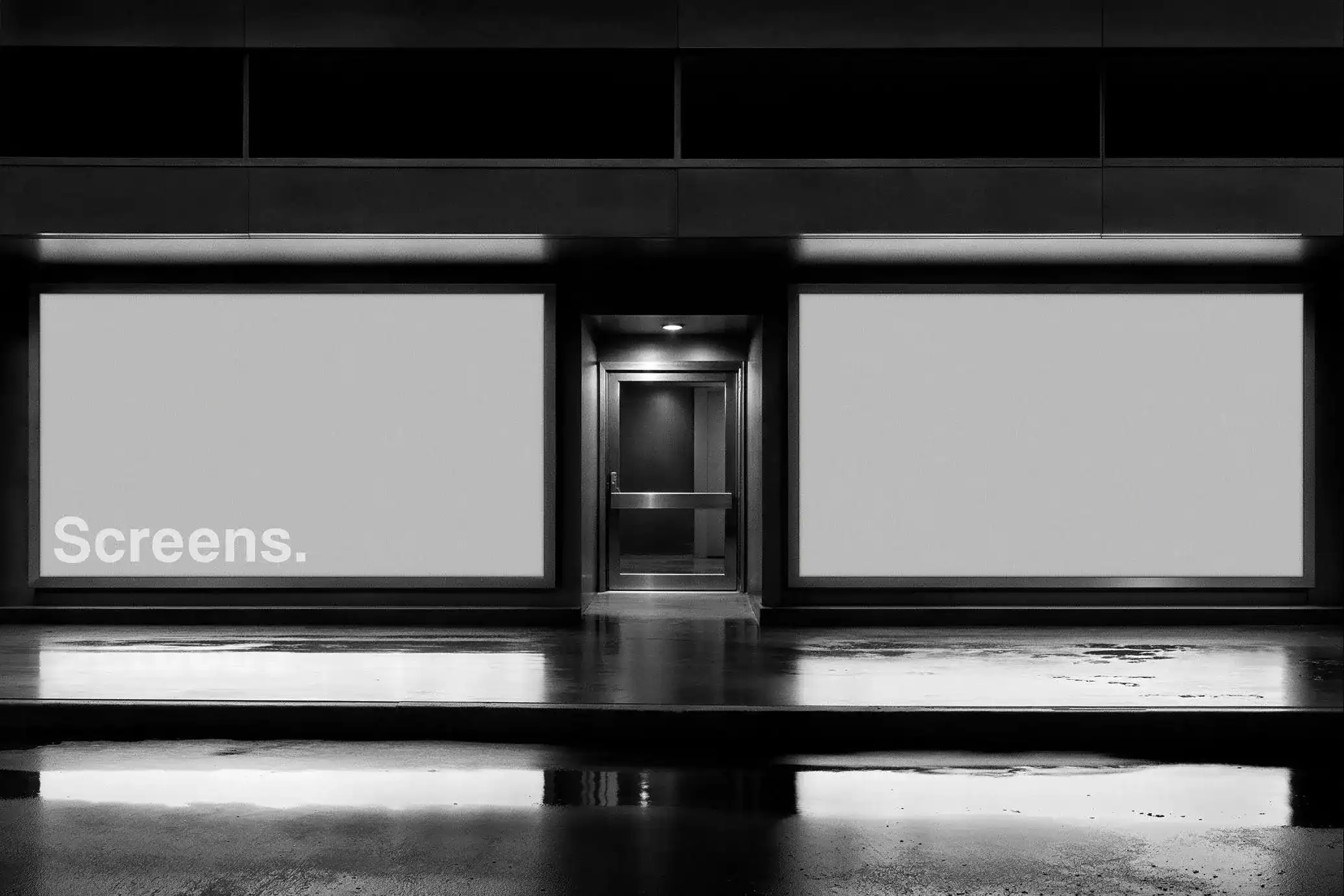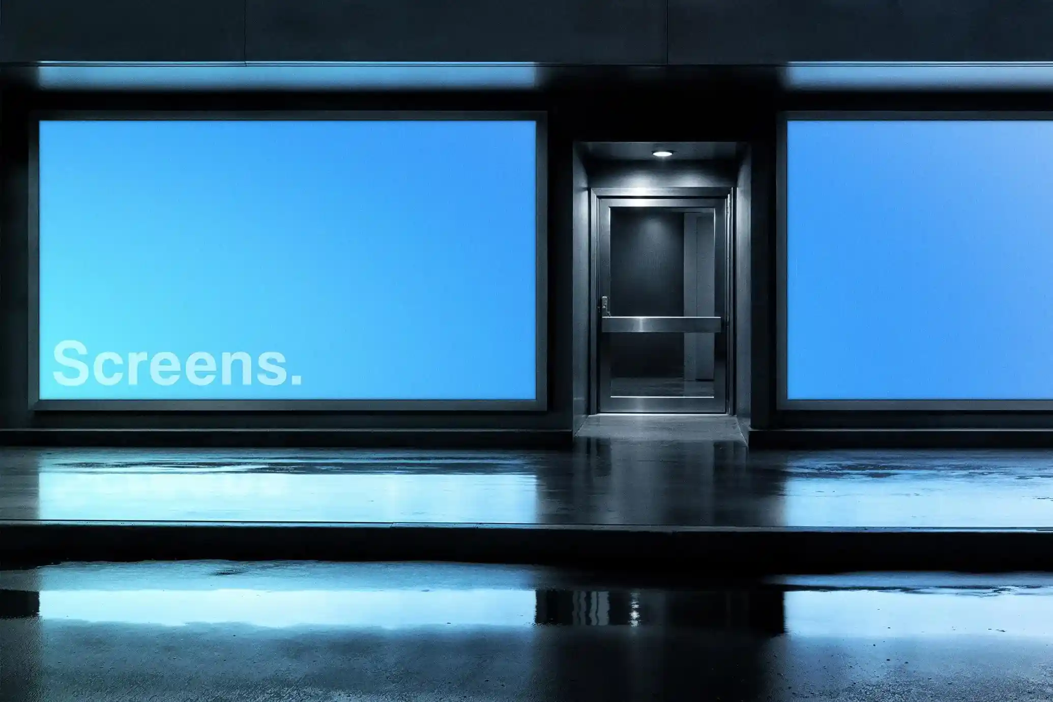 The symmetrical composition frames a centred doorway with a pair of luminous screens, set against a reflective wet pavement. This mockup is perfect for those who want their work to stand out in a clean, minimalist, and high-tech environment. The dark tones and subtle glow create a calm, professional feel that complements tech branding, fashion promotions, digital advertisements, and creative portfolios.