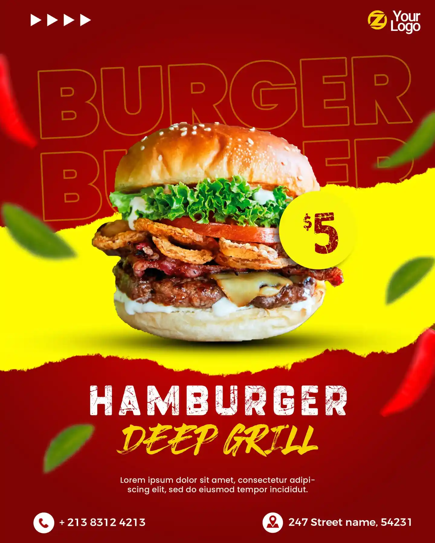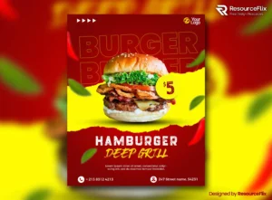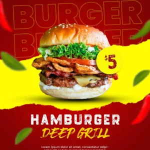 This versatile hamburger advertisement template is also perfect for food trucks, cafes, diners, or catering services. You can adjust the headline, pricing, or even the burger photo with just a few clicks in Photoshop. Every element is editable so you can adapt the design to your unique burger promotion — whether you’re offering a two-for-one deal, highlighting a new menu item, or running a weekend burger festival.