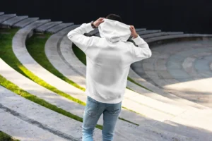 This PSD mockup features a rear view of a male model in a plain white hoodie, allowing your graphics, typography, or branding to shine clearly. Thanks to Smart Object layers, you can quickly insert your artwork and customize the mockup with just a few clicks. Want to change the hoodie color? Adjust shadows? Update the background? It’s all editable—giving you full creative control without compromising realism.