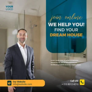 The flyer places your key message front and center. Headlines like We Help You Find Your Dream House or Join Online sit comfortably in bright, eye-catching typography. The color palette blends teal, gold, and white, creating a polished corporate mood without feeling cold.