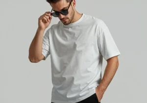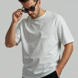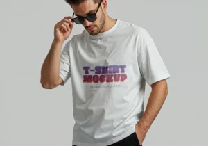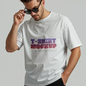 The mockup showcases a white oversized T-shirt worn by a model adjusting his sunglasses, giving off a natural and photorealistic urban vibe. It’s shot in natural lighting with smooth shadows and realistic fabric folds, making it ideal for showcasing logos, graphics, and typography in a professional setting. You can easily replace the artwork using smart objects in Photoshop and create a polished result within minutes.