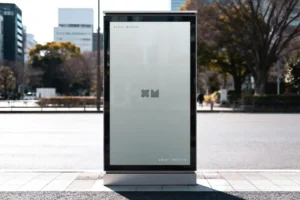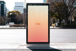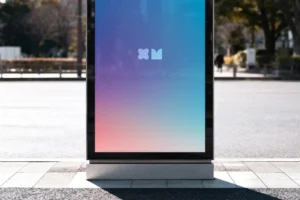 The mockup features a vertical display stand placed in a bright, city-like environment. The balance of natural lighting and urban reflections gives your poster a genuine outdoor look. Whether you’re promoting a branding campaign, a music event, or a movie release, this mockup enhances your visuals with professional depth. The combination of sharp contrast and realistic highlights ensures your design looks vivid and eye-catching on screen.