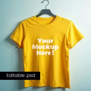 The yellow t-shirt is displayed on a hanger, creating a natural and lifelike presentation that highlights the details of your design. With accurate shadows and a high-quality resolution, your designs will look as if they were photographed in a studio, making them stand out to clients, investors, and social media followers.